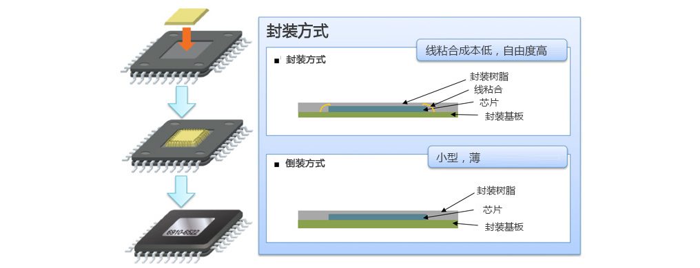 完成后的芯片通過(guò)線粘合和再配線層,配線于封裝基板和硅支持基板等中。之后,芯片用樹(shù)脂封裝完成。