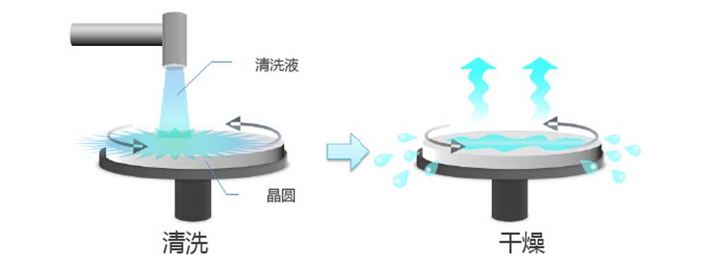 這個(gè)過(guò)程叫做清洗。主要為了去除附著在表面的異物。如果晶圓上有異物,之后再結(jié)晶成長(zhǎng)工藝和光刻工藝中會(huì)產(chǎn)生不良。通過(guò)過(guò)酸化氫和鹽酸、氫氟酸等清洗液去除晶圓上的粒子和金屬,有機(jī)物。之后用非常干凈的被稱作超純水的清洗用水流動(dòng)清洗,旋轉(zhuǎn)干燥。潮濕的話,空氣中的粒子可能會(huì)污染剛洗凈的晶圓。