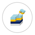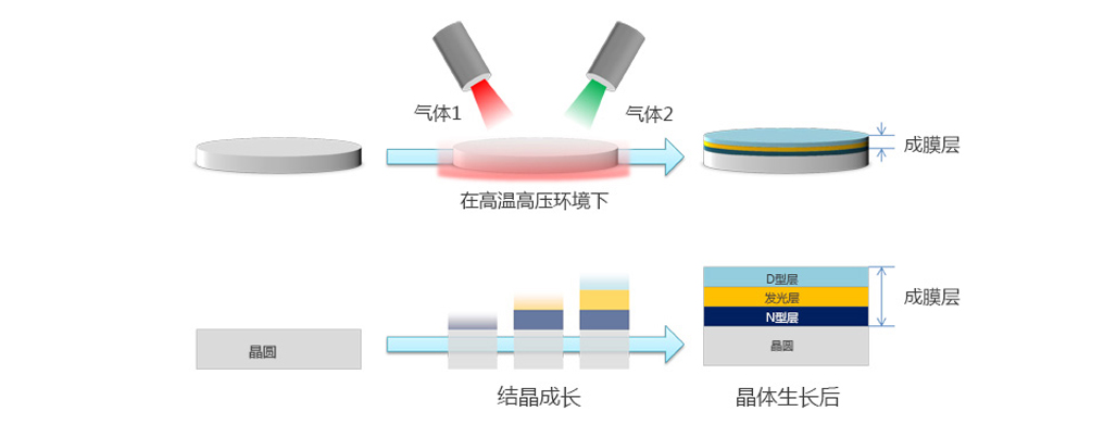 接下來是“晶體生長”。在這里,我們在晶圓上制作用于發(fā)光作為LED的薄膜。頂部是過程的俯視圖,底部是橫截面。在晶片周圍的高溫高壓環(huán)境下吹入氣體,并通過化學(xué)反應(yīng)在晶片表面上沉積形成薄膜。這樣重復(fù)多次以制作多層薄膜結(jié)構(gòu)。